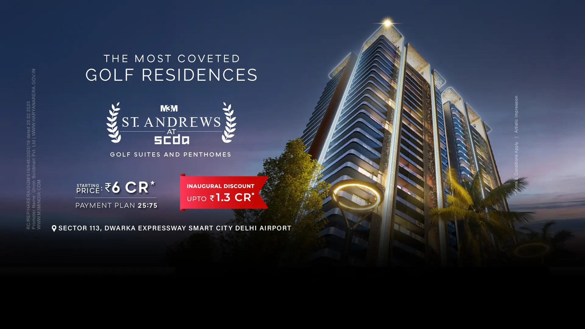 St. Andrew’s, an exclusive collection of Golf Suites and Penthouses, is nestled within the prestigious 250-acre master development of SCDA (Smart City Delhi Airport), offering the epitome of refined luxury living. With breathtaking views of lush golf landscapes and the city skyline, it is a sanctuary of beauty and serenity. Meandering water features, meticulously designed spaces, and the seamless flow of urban life create an unparalleled environment — where the rhythms of a vibrant city and the calm of a forest are all within your reach, and you never have to step beyond this exquisite and luxurious haven.